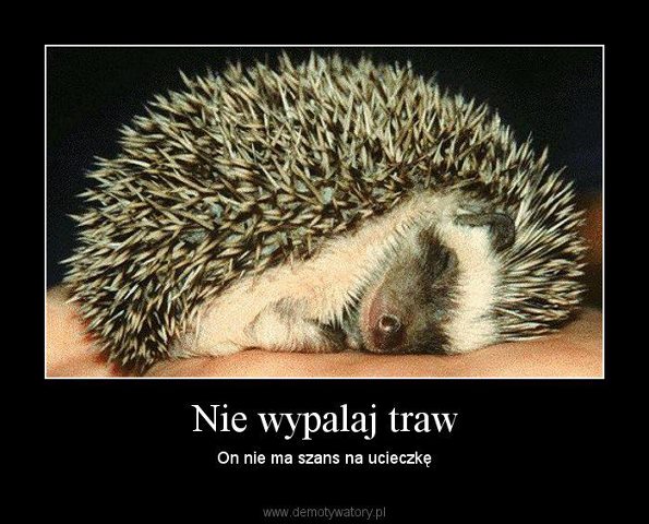 Przypominamy, że wypalanie traw na wiosnę to zwyczaj głupi i szkodliwy. Nie zabija bakterii, ani zarodników grzybów, jak zdaje się wierzyć wiele osób, nie przyspiesza rozwoju roślin! Wypalanie traw to coroczna masakra małych zwierząt, które nie mają jak uciec i giną w męczarniach! Coraz mniejsza na naszych łąkach różnorodność gatunkowa, coraz mniej płazów, gadów, jeży (gatunek chroniony!). Nie wypalajcie traw na wiosnę!
