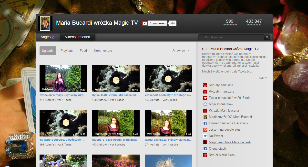 Wczoraj padla magiczna liczba 999 subskrybentow na Youtube http://www.youtube.com/user/MariaBucardi? Bardzo dziekuje za Wasze zaufanie. Z anielskim pozdrowieniem Wasza Maria Bucardi